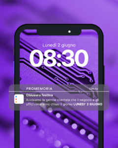 Avvisiamo la gentile clientela che il negozio e gli uffici il giorno:LUNEDI’ 2 GIUGNOrimarranno chiusi.